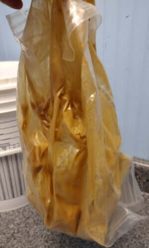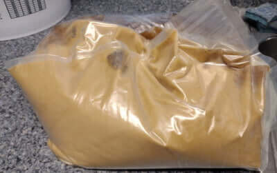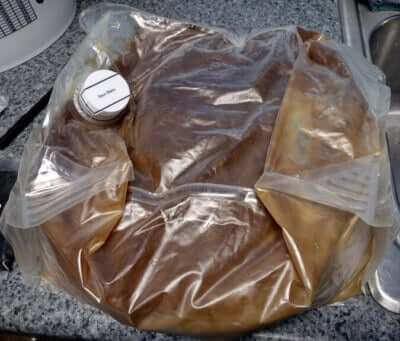 The last bit had to be squeezed out, as it was very thick from being partially frozen. Rinsed the bag twice, adding the water to the fermenter. At this point the fermenter was about half full, so I stirred for 1 minute.