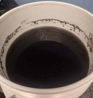 The first action is to put 1 gallon water in the primary, add the carbon, and stir well. As expected, the carbon produced some dust which swirled up and coated the inside of the fermenter. Unlike laser printer toner, this wipes off easily! However, I strongly recommend pouring gently and stirring gently at first. Once the carbon is dissolved in the wine, it’s no longer a problem.