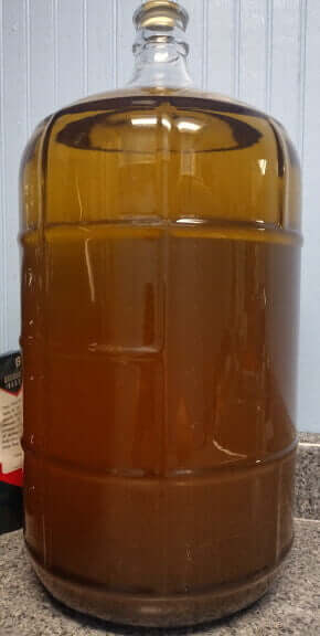 Today the wine is clear and looks a bit dark. However, there is a layer of carbon on the bottom of the carboy, and that will darken the perceived color. As noted in the Chardonnay in Detail blog, the color is also affected by the thickness of the wine the light is refracting through, the background, and the amount of light.