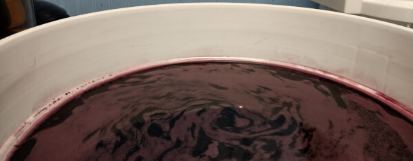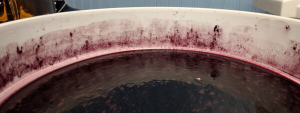The two wines are foaming differently this morning. The suds (large bubbles) on the Blackberry subsided and it had fine shimmer on the surface. In contrast, the Strawberry still has suds.