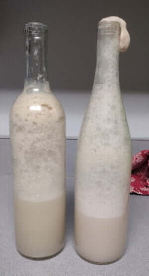 By 8 AM, both starters foamed up really well, filling the bottle with foam. These overnight starters work amazingly well. The initial temperature (mid-90’s F) is more ideal for the yeast, which likes warmer. Wine does better with cooler temperatures (60’s and 70’s F), but the initial temperature helps the yeast multiply, so the colony introduced into the wine is much larger. By the time the next morning rolls around, the starter has dropped to room temperature, so the yeast is acclimated to the wine’s temperature.
