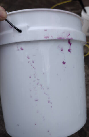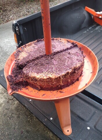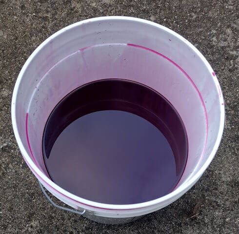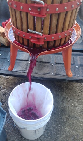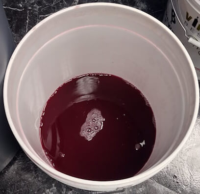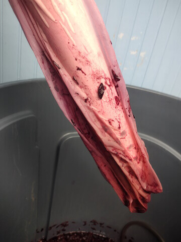 But it does have drawbacks. The small food-grade bucket we use to collect pomace from the primary fermenter and dump into the press is stained. I used a pressure washer on the bucket and it didn’t remove the color. This wine WILL stain things.