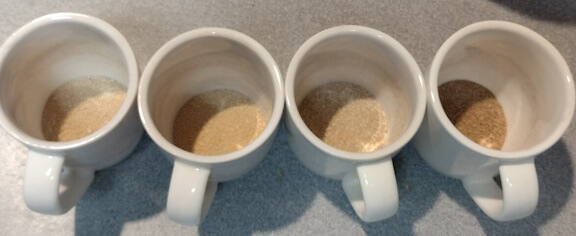 I always thought of yeast just being yeast. However, as the picture shows, the strains look different. The two on the left are Renaissance TR-313, which are for the Vidal batches I’m also starting today. The next one is Avante, and the one on the far right is Bravo.