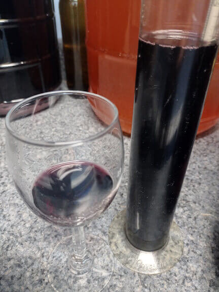 We have a gallon of ’23 Merlot sitting on the shelf, so I drew 10 ml of it and 90 ml of the Chambourcin. THAT is much better. So we added the gallon of Merlot and bottled. The grand total is 56.5 bottles of wine.