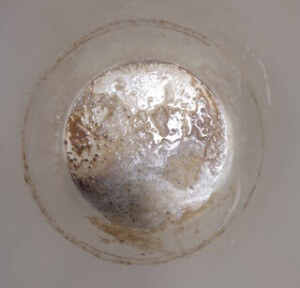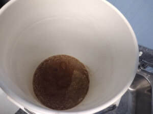 Then I noticed that there were particles on the side of the container, just above the must. This indicates that at some point, there was foam about 3/4″ (1.9 cm) high. The photo at right shows this.