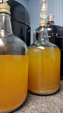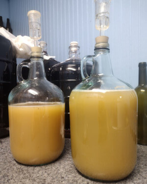 Next I racked the wine into a pair of 4 liter jugs, with neither full as the wine is still fermenting. Filling the container too full is a great way to overflow the wine into the airlock, and onto the counter.