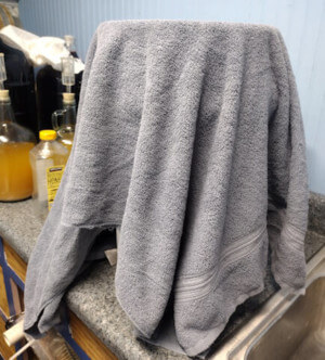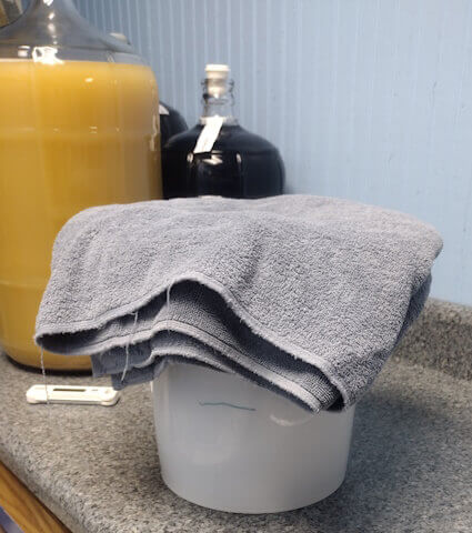For the towel, I took the bath towel I used for the other batches and folded it in quarters, then dropped it on top. It’s not a tight seal, and probably will let less air pass. To compensate, I’ll stir 4 times per day.