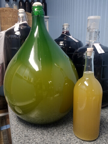 The wine fills a 25 liter (6.6 US gallon) demijohn with a 1.5 liter bottle leftover. When I rack off the sediment, I’ll probably have just the demijohn.