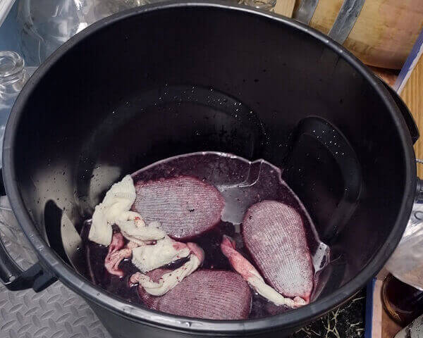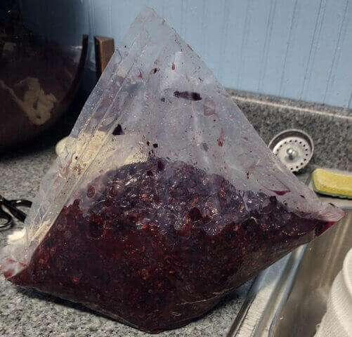 Put the initial addition nutrient packets in a 20 gallon Rubbermaid Brute. Poured the reconstituted must into the Brute. Put half of one dried skin pack in a provided muslin bag. Added one seed packet and one oak chips packet, then added the remainder of the skin pack. Tied the top of the bag in a knot and added to fermenter. Repeated for second dried skin pack. Stretched a muslin bag over a 1 gallon food grade bucket and dumped one natural skin pack into it. Tied the top of the bag in a knot and added to fermenter. Repeated for second natural skin pack. Rinsed both bags with a couple of cups to water to get the residue. Waste not, want not. Did not check SG as there’s no point at this time. |