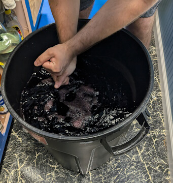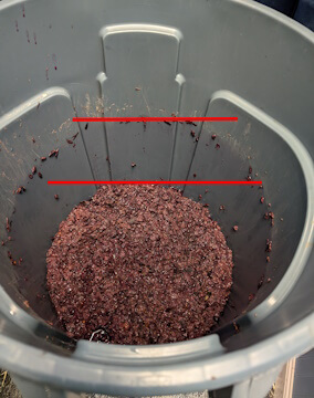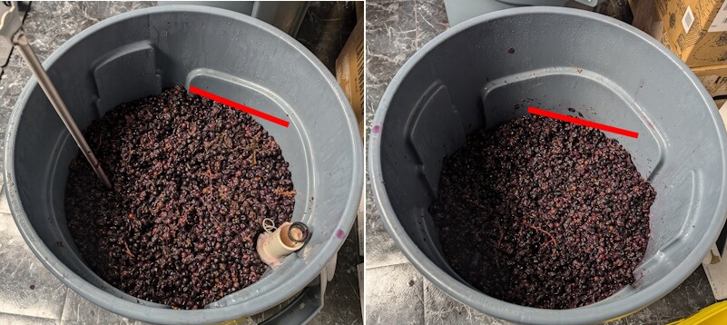 I took before and after photos of a Chelois bucket before punching down. This illustrates why I never fill a primary more than 3/4 full of grapes. The difference in height after punch down is significant.