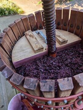 We added rice hulls to help with extraction. Sprinkling rice hulls in layers in the must as we add it to the press makes conduits where wine can escape. I’ve noticed a significant increase in the amount of wine extracted when using rice hulls.