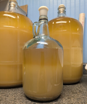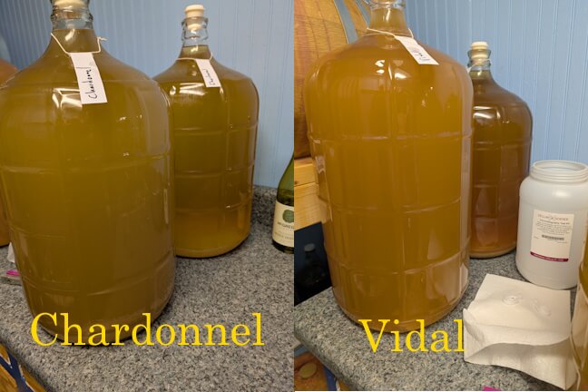 I examined the clarity of the Chardonnel and Vidal, fined vs. unfined. The carboys fined with bentonite are noticeably clearer. I didn’t take any photos, as I question if the difference will show in photos. So I taste tested – there is no difference in aroma or taste, which is what I expected.