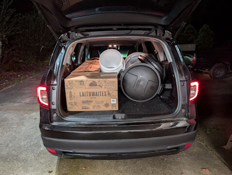 The drive home was pleasant, if a bit long. Once there we unloaded the grapes and moved them into the cellar. The containers the grapes were in are for travel purposes. We needed them light enough for us to easily move them.