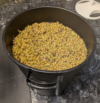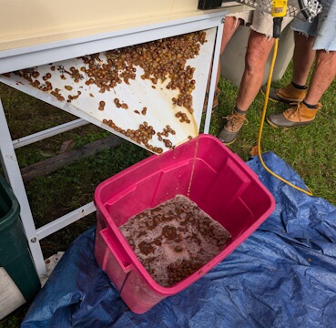 This year the crusher is motorized, which is much easier than hand cranking, especially for 725 lbs of grapes. My back and shoulders are thankful for the change!
