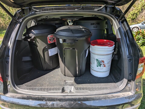 - three 20 gallon Rubbermaid Brutes about half full of red