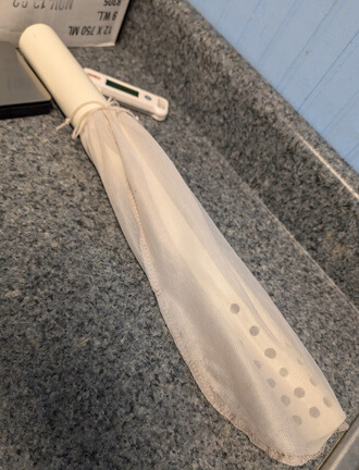 The next photo shows the jig with the mesh bag. I purchased the narrowest bag I could find that was tall enough. The larger the bag, the more there is to clean after use!