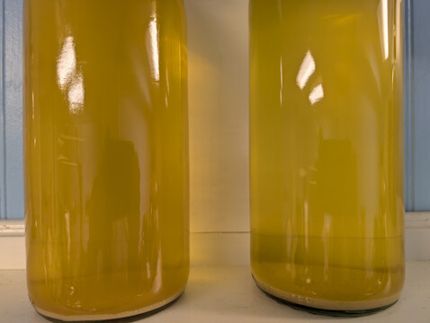 The photo shows the previously treated carboy of Chardonnel on the left, and the newly treated carboy on the right. The orange hue is a good indication that the wine was fermented on the skins. In the glass, it looks far more normal.