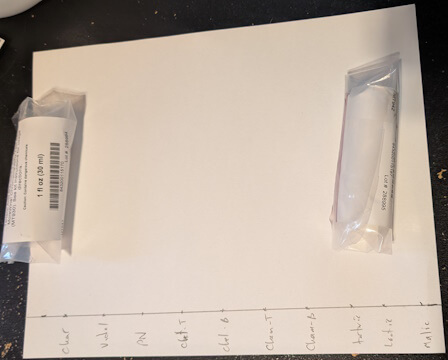 Then label the points with the name of the substance that will be tested at each point. In the sample above. Then put 1 drop of substance on each point using the pipettes included in the test kit.