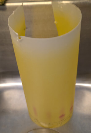 Using staples, form the test sheet into a cylinder. Pour 1/2″ solvent into the test jar, drop the test sheet in (sample side down), screw the lid on, and wait 24 hours.