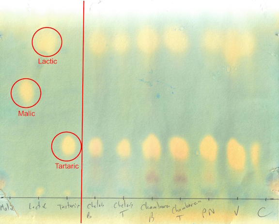 The test shows a lot of tartaric acid (more intense spots at the bottom), and a lesser amount of lactic acid (less intense spots at the top). There is no malic acid remaining (no spots in the middle), so the MLF ran to completion!!!