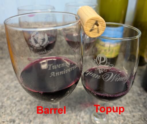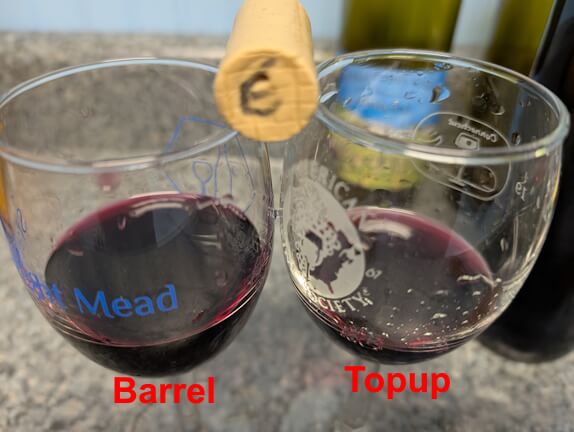 The barrel wine is slightly darker. The tannin is also slightly more pronounced, which is probably because the barrel was dosed with Quertanin Sweet finishing tannin, while the topup received nothing. The difference in tannin in not huge, but it makes the barrel a better wine.