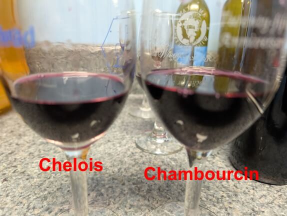 Look at the edges of the wines in the following photo. The Chelois is “red” while the Chambourcin is “purple”. No mistake, both wines have fantastic color, but the Chambourcin is the winner by a lot more than a nose.