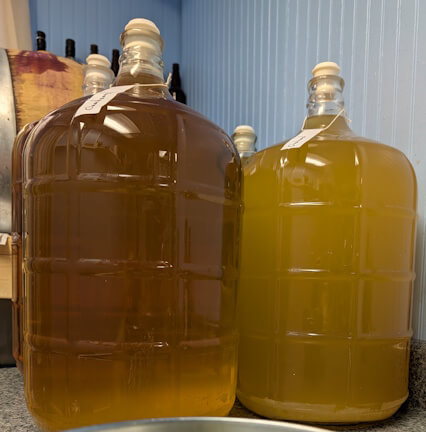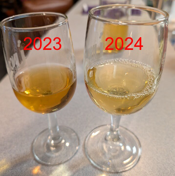 And while the color is lighter in the 2024, it’s definitely and “orange” wine. The side graphic shows the wine in the glass versus the carboy. The carboy appears darker because the wine is deeper, so the color is more obvious.