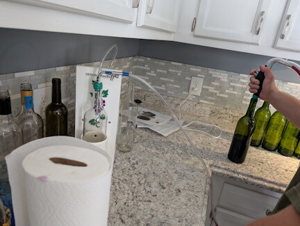 We all agreed that bottling with a gravity filler tubes is off the table. This was so much easier, faster — AND less messy. We always over fill a few bottles with the filler tube.